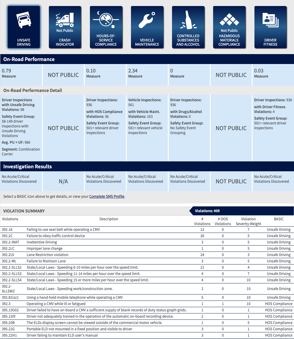 SMS is an important tool that carriers should be using routinely to track their roadside inspections and the types/severity of violations discovered during those inspections. As shown in the example below, SMS contains a list of all roadside inspections and violations your fleet has incurred over the past 24 months. In each BASIC, you can see exactly what types of violations are contributing most heavily to your scores. In addition, if you are logged into your own carrier account, you can also see which drivers and which vehicles are incurring the most (and most serious) violations.