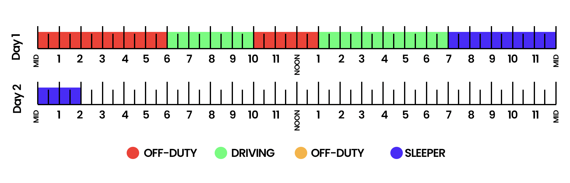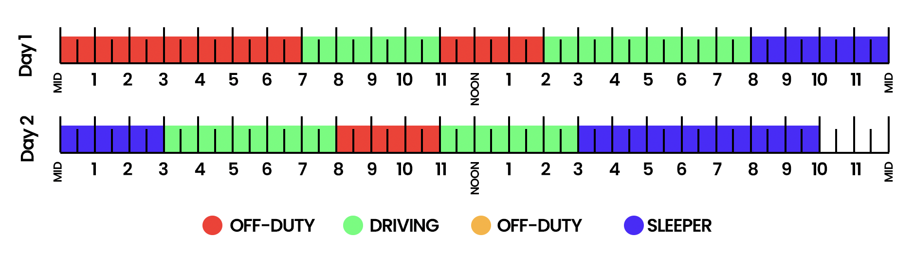 - Break 2: 8 PM to 3 AM (7-hour sleeper berth) – Used as the second qualifying period for the split sleeper.Split Sleeper Application: The 3-hour off-duty break and 7-hour sleeper berth meet the 10-hour rest requirement, allowing the driver’s HOS clock to reset based on the end of the first break, at 2 PM on Day 1.Driving Total: By the end of Day 1, the driver has driven a cumulative 10 hours (4 hours before Break 1 + 6 hours after).Available Hours: A new 14-hour duty window starts from 2 PM, allowing the driver to drive up to 11 hours within this period, until 4 AM on Day 2.