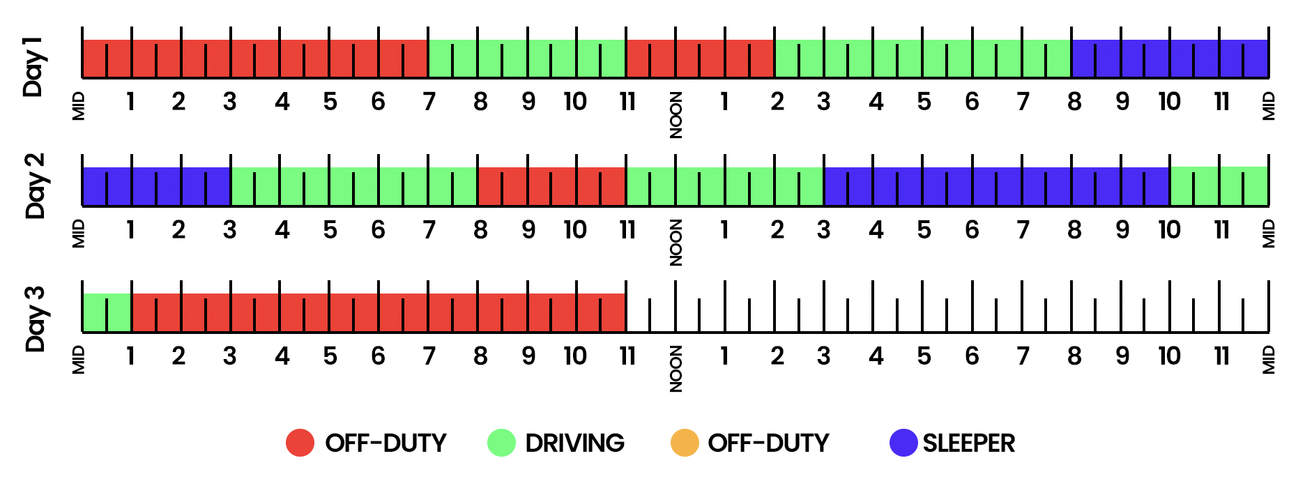 - Day 3: The driver transitions to a full 10-hour off-duty period, allowing for a complete HOS reset without splitting the rest period.