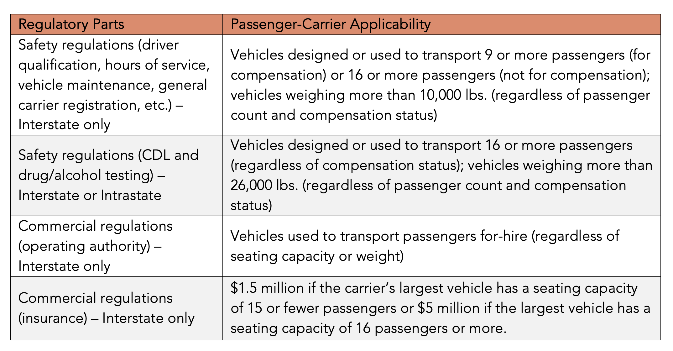Lastly, and putting aside safety-related regulations, the FMCSA also administers certain "commercial regulations," aimed at ensuring certain types of carriers are properly licensed and authorized. As they pertain to passenger carriers, these regulations are generally applicable to for-hire interstate transportation of passengers in any vehicle, no matter the GVW, GVWR, or passenger capacity. However, the required level of insurance--which is often linked to these commercial regulations--does, in fact, depend on the number of passengers the carrier's vehicles are designed to transport. For example, the required level of insurance is $1.5 million if the carrier’s largest vehicle has a seating capacity of 15 or fewer passengers or $5 million if the largest vehicle has a seating capacity of 16 passengers or more.