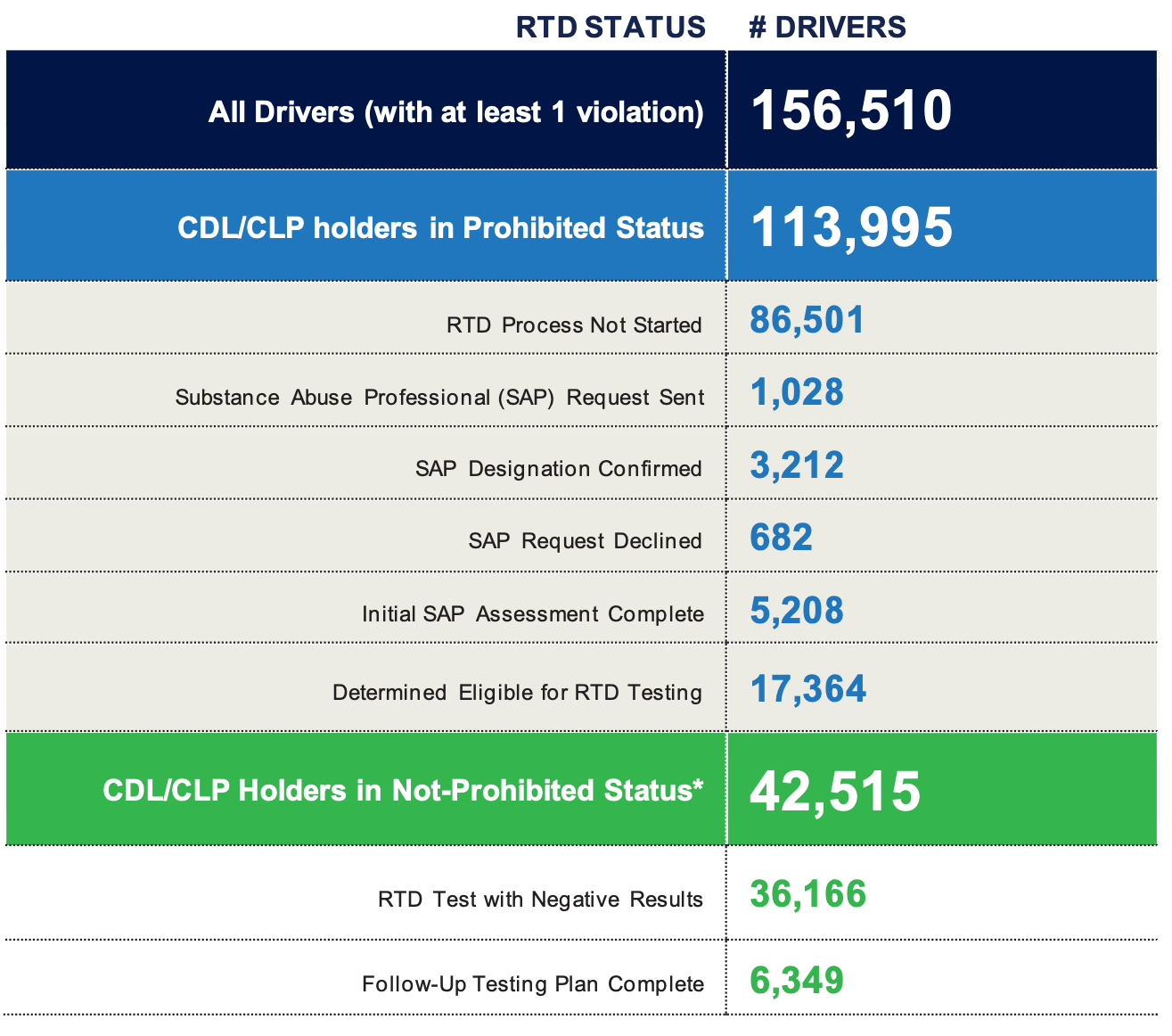 The FMCSA has kept detailed track of Clearinghouse data over the past three years. In fact, it publishes monthly reports that summarize things like how many users have registered, how many drivers have tested positive, what types of substances are causing problems, and how many drivers have and have not started the return-to-duty process.