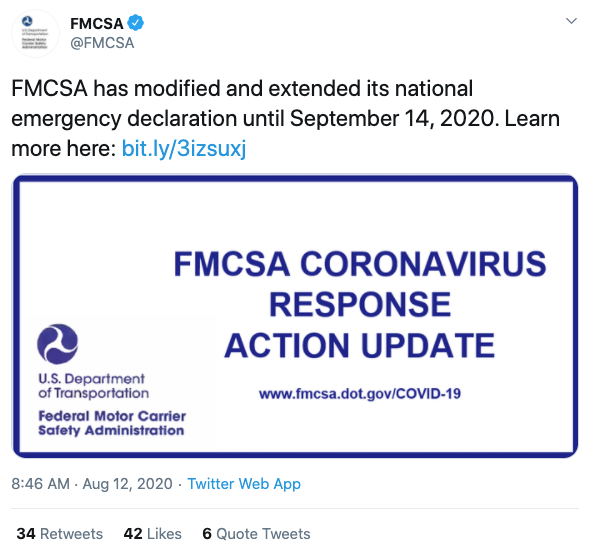 On Wednesday, the FMCSA announced an extension of its COVID-19 emergency declaration through September 14, 2020. Like prior versions, the extended declaration provides certain regulatory relief for carriers and drivers providing direct assistance to the pandemic emergency relief efforts.