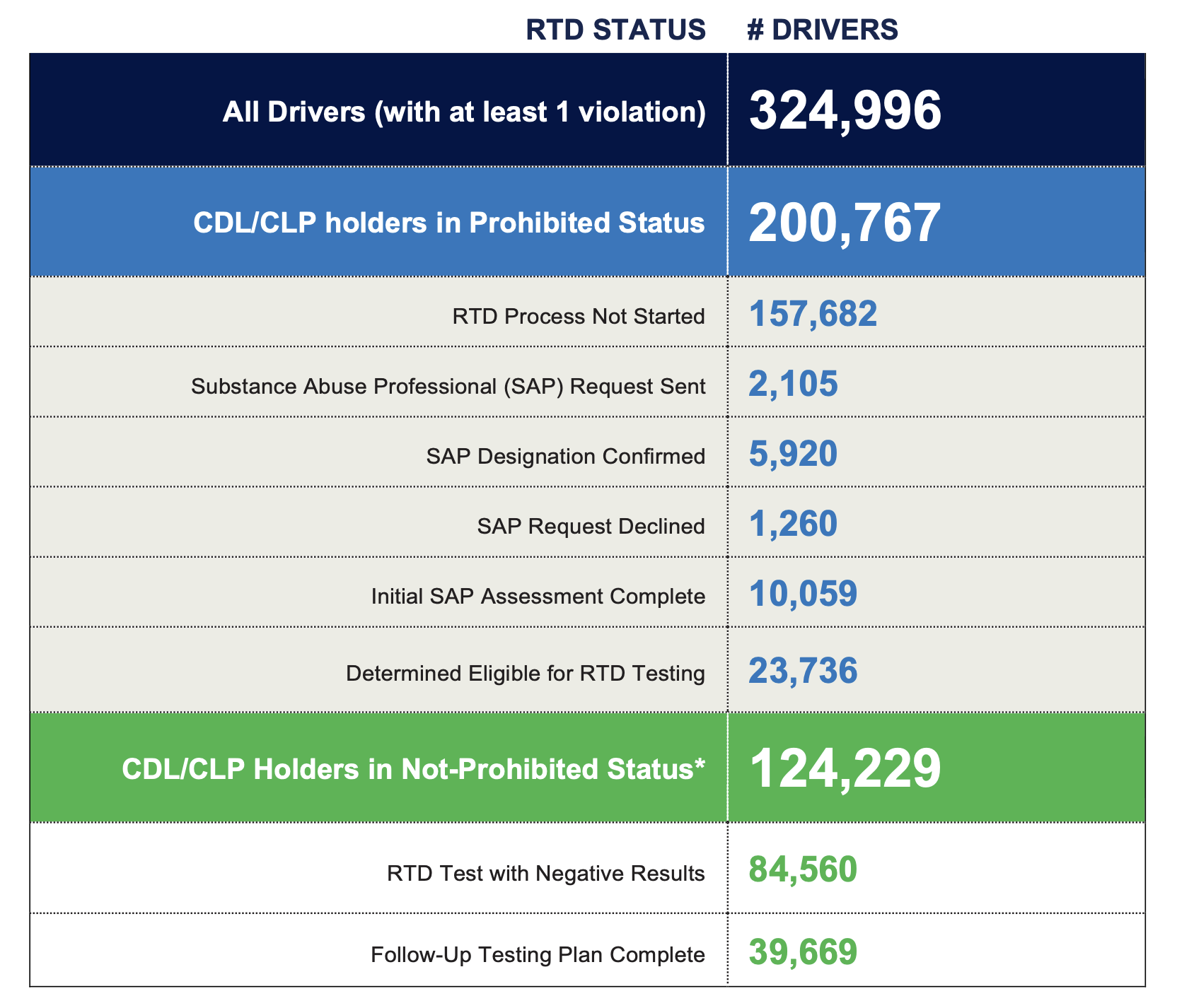 - Of those prohibited drivers, over 150,000 haven't even started the return-to-duty process
