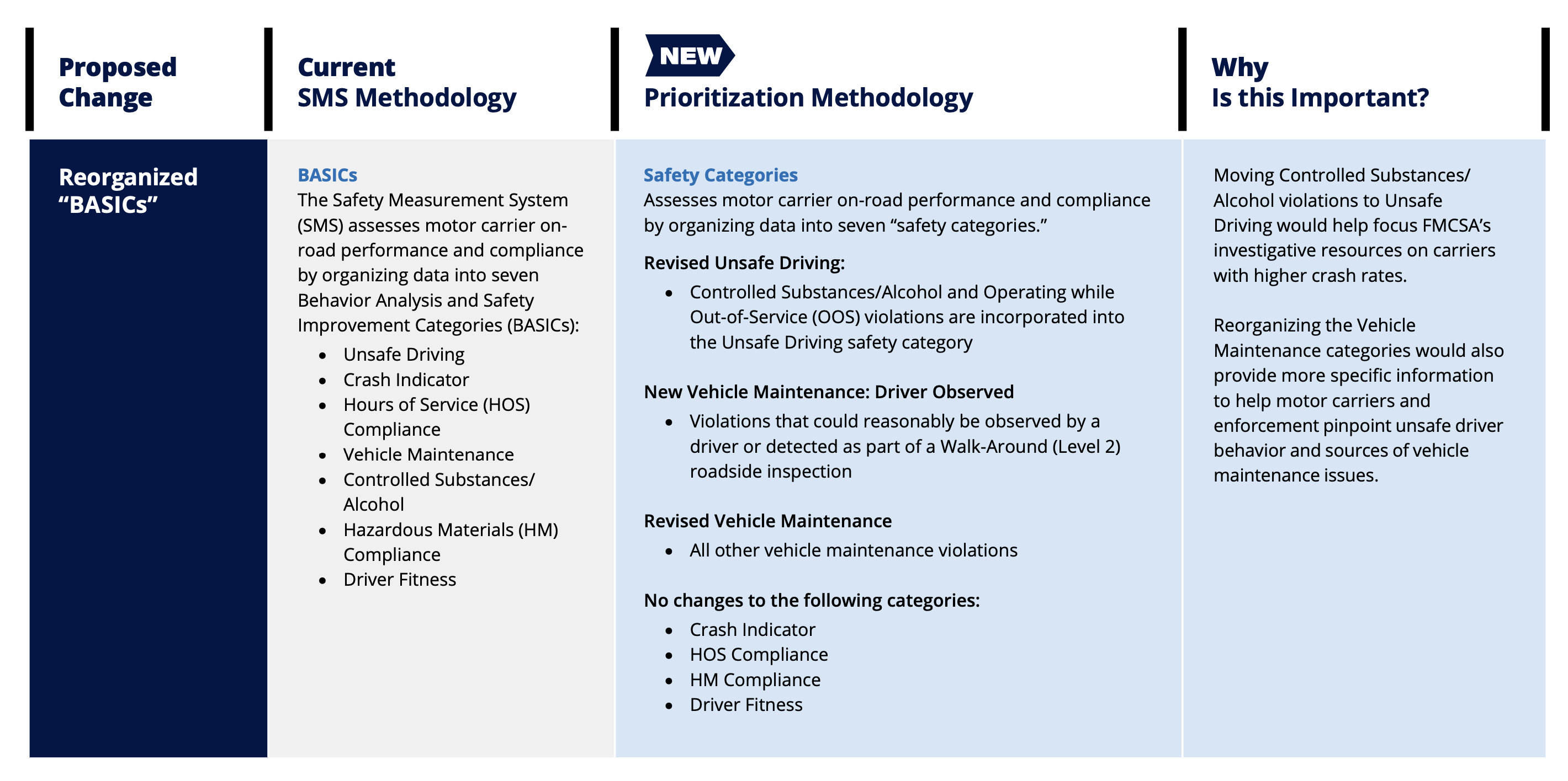 In terms of "reorganizing" the current BASICs, the FMCSA is proposing to combine the existing drug/alcohol BASIC into the Unsafe Driving category and then splitting out the Vehicle Maintenance BASIC into two separate categories that will be called Vehicle Maintenance and Vehicle Maintenance: Driver Observed. BASICs will now be called "safety categories."