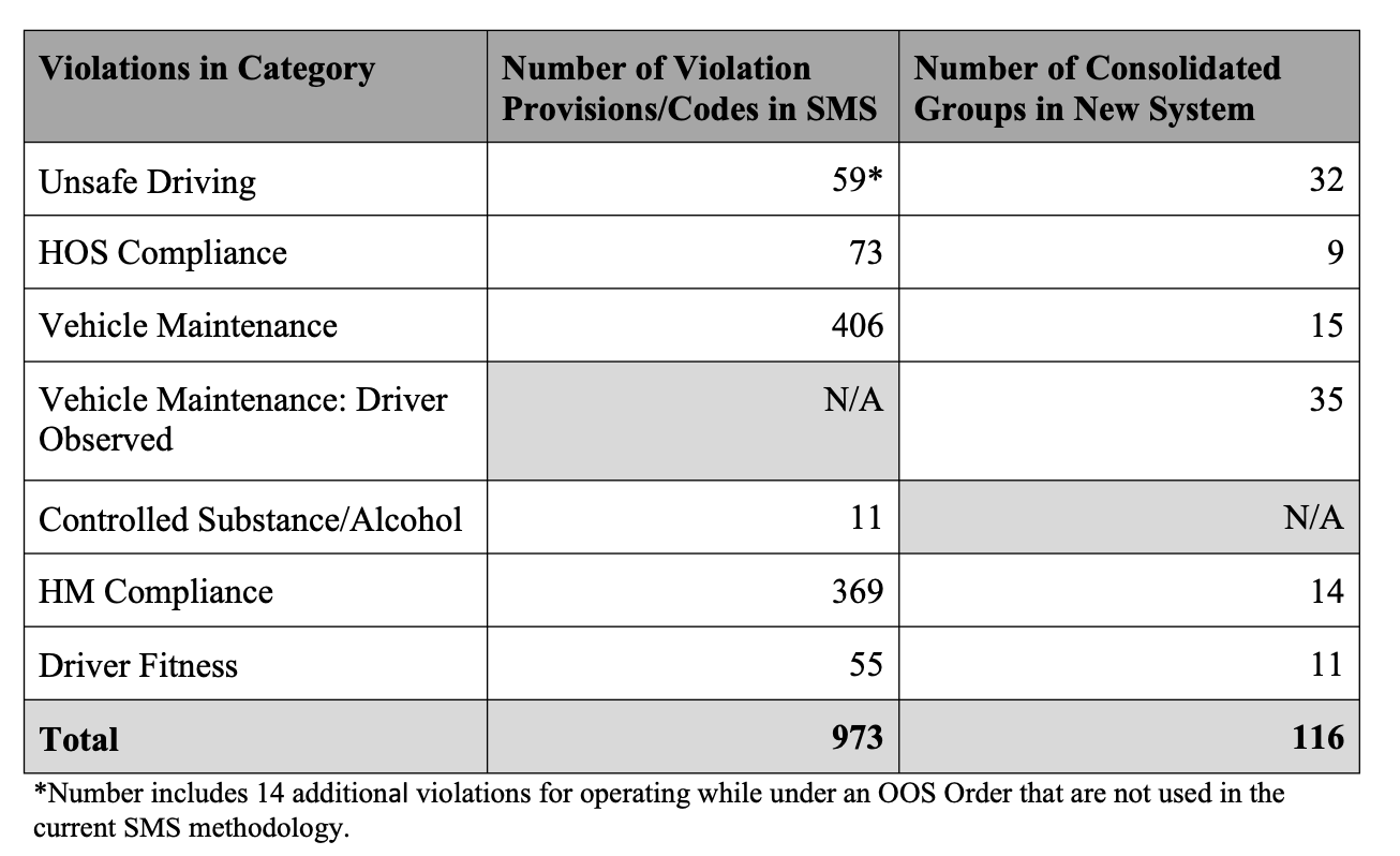 The agency is also proposing to consolidate the existing universe of violations that filter into the SMS system. According to the notice, SMS currently accounts for 959 separate violations. The revised system will group similar violations together with one another, resulting in 116 violation "groups." For example, the existing 73 separate hours-of-service violations will be combined into a total of 9 violation groups.