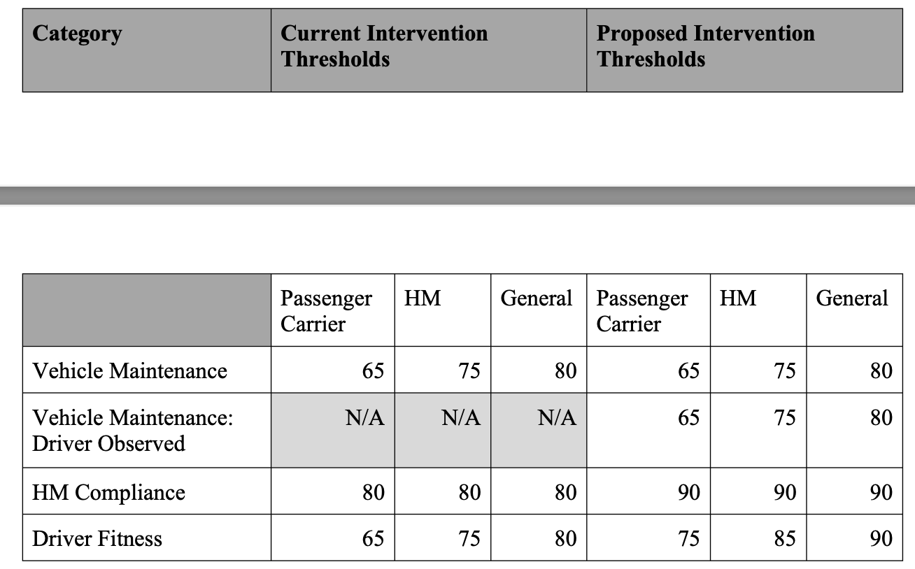 Lastly, FMCSA is proposing minor changes to some of its existing intervention thresholds, the cutoffs at which carriers are prioritized for enforcement. Thresholds for the Unsafe Driving, Crash Indicator, and Hours of Service safety categories will remain the same. In addition, the existing thresholds for the Vehicle Maintenance category will extent to the new Vehicle Maintenance: Driver Observed category. The Driver Fitness thresholds will increase from: