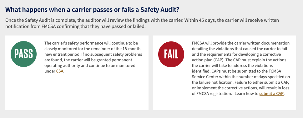 New entrant audits are pass/fail, and carriers will be notified of their results within 45 days after the completion of the audit. Carriers who fail their new entrant audit will receive a list of violations that caused the failure, and instructions for developing and submitting a corrective action plan (CAP). CAPs must be submitted within the time frame set forth in the notification, and if they are accepted, the carrier will move out of the new entrant program. If the CAP is not accepted (or if the carrier fails to submit one), the FMCSA will revoke the carrier's USDOT registration and operating authority (if applicable). Carriers who fail the new entrant audit cannot re-apply for DOT registration until 30 days after the revocation date. Once they do, they will once again be placed in the new entrant program and will be subject to another audit within the first 12 months.