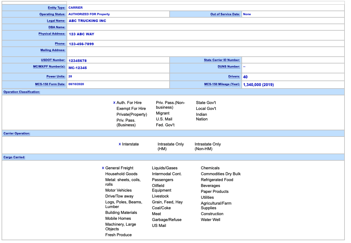 Once you locate your SAFER records, you will see the following screen, which lists your basic carrier registration details such as contact information, number of power units, number of drivers, and the type(s) of cargo that you haul.