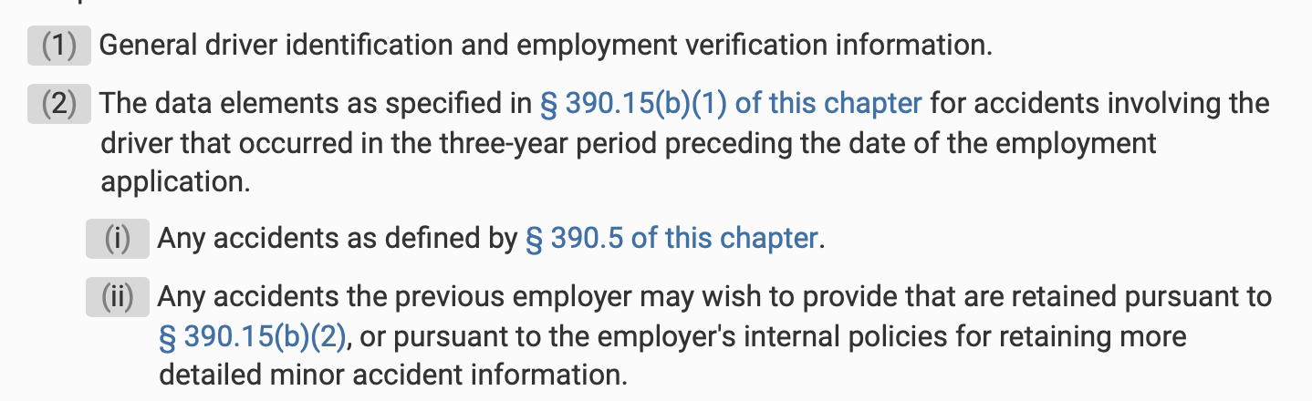 The second--and the subject of this article, specifically--involves making safety performance history inquiries with the applicant’s previous DOT-regulated employers. Importantly, this requirement applies only to driver-applicants who have previous CMV driving experience within the three years preceding their application date. Drivers who have no CMV driving experience in the three years preceding their application date require NO verification of employment under DOT regulations.