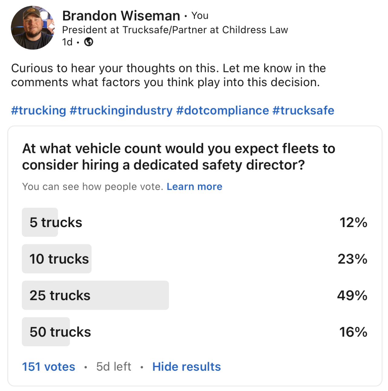 The size of your fleet plays a big role in the decision of whether to hire a dedicated safety director. We recently posed the following question to our LinkedIn followers: